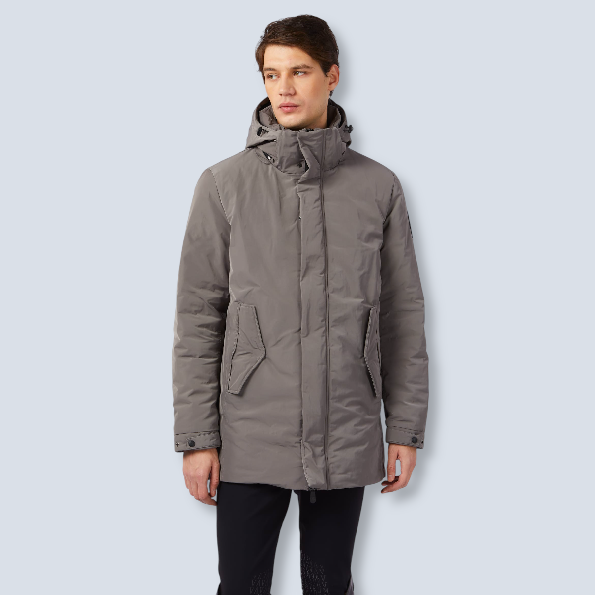 Es una chaqueta larga acolchada, diseñada para hombre, hecha de tejido técnico repelente al agua y resistente al viento. Es un modelo largo y cuenta con cremalleras en las aberturas laterales, lo que permite un ajuste cómodo y libertad de movimiento.
