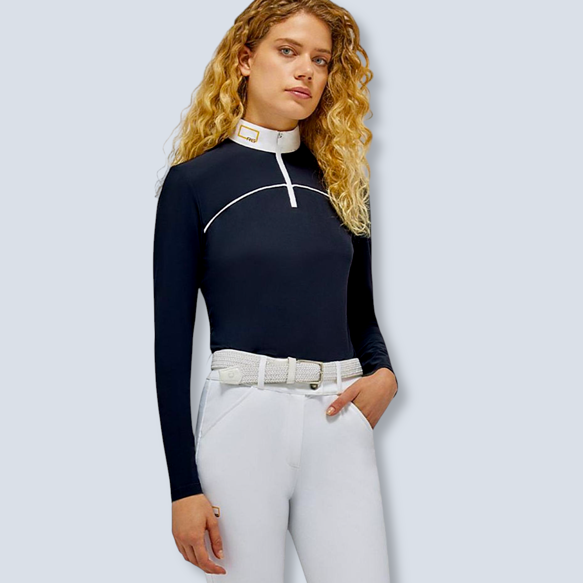Polo de competición de manga larga diseñado para ofrecer comodidad, rendimiento y estilo profesional durante entrenamientos y competiciones ecuestres. Ideal para jinetes que buscan una prenda técnica y elegante en la pista de doma o salto.